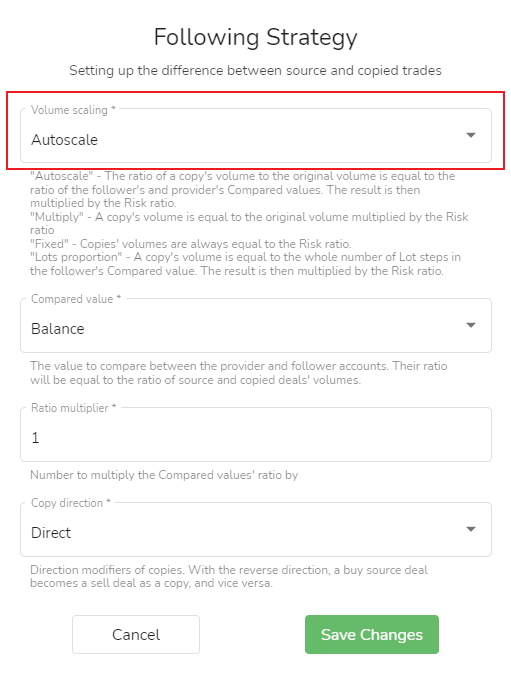 يعتمد حجم تداول النسخ على الرصيد الحالي أو حقوق الملكية لحساب التابع. يمكن للمتابعين تعديل حجم تداول النسخ وفقًا لرصيد الحساب الجاري أو صافي القيمة للتحكم في مخاطر النسخ