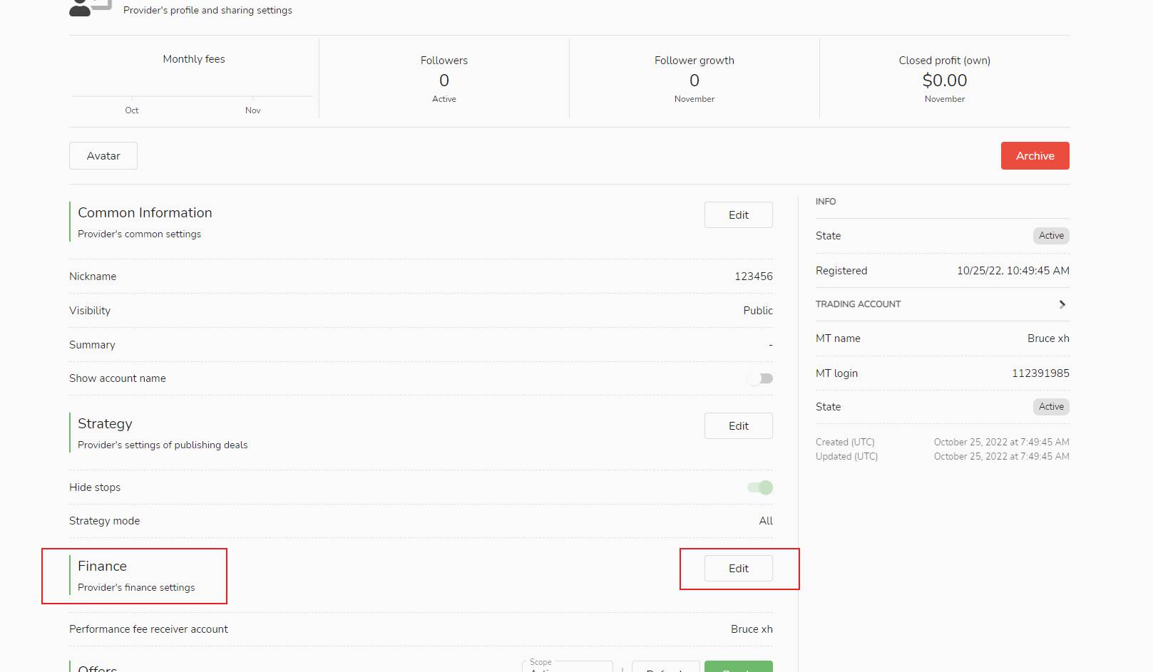 - ضمن العمود "My Signal Sources" ، حدد "Performance Fee Receiver Account Settings" وانقر فوق الزر "Edit".