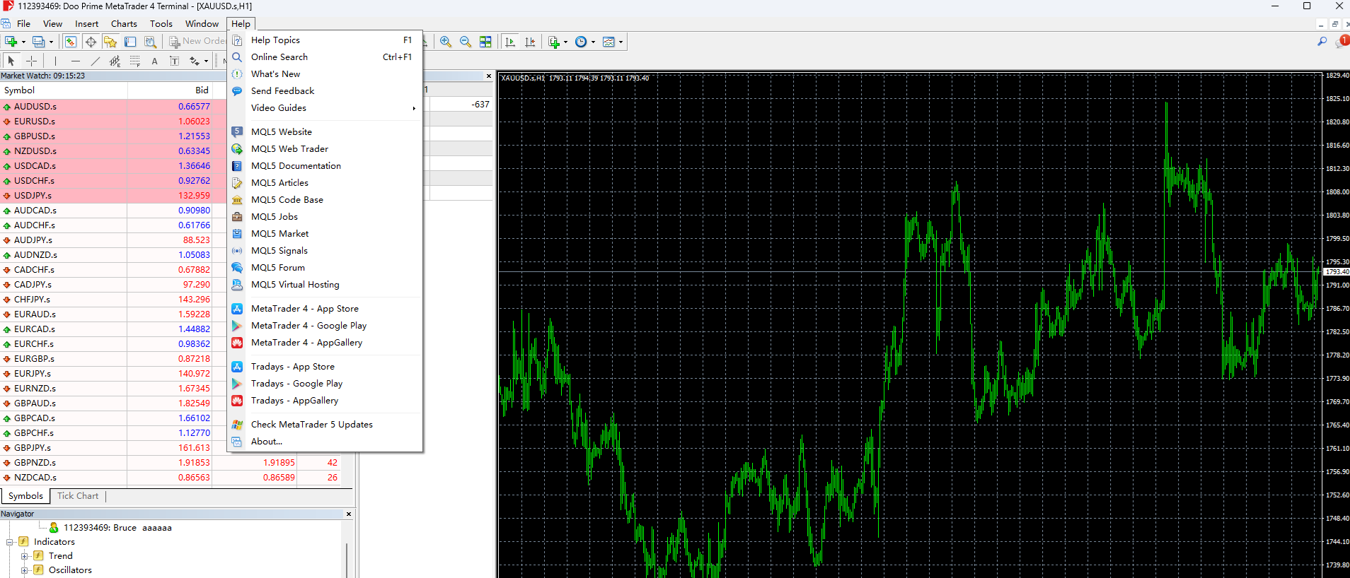 1. بعد تسجيل الدخول إلى MT4 ، انقر فوق "مساعدة" في شريط القائمة العلوي وحدد "حول".