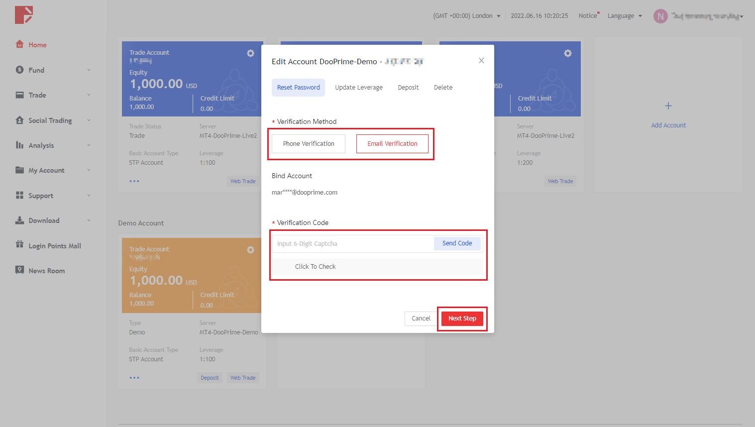 2. Click “Reset Password”, choose “Phone Verification” or “Email Verification”, click “Verify”, and press “Next Step” after receiving the verification code.
