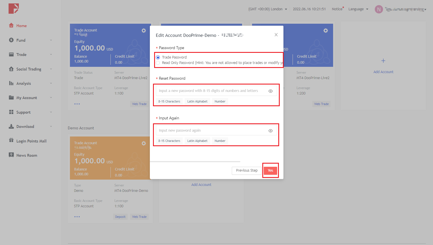3. Select the preferred password type, reset a new password with a combination of 8-15 digits and letters, enter the new password again, and press OK. After resetting the password, the account will be verified through mail or mobile phone, and then users may activate the new password.