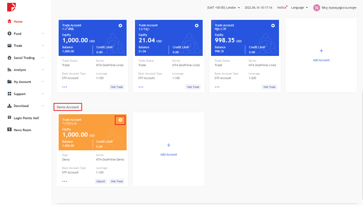 1. Users may log in to the Doo Prime User Center, find the account for which users have forgotten the password, and then click the gear-like icon in the upper right corner to reset the password.