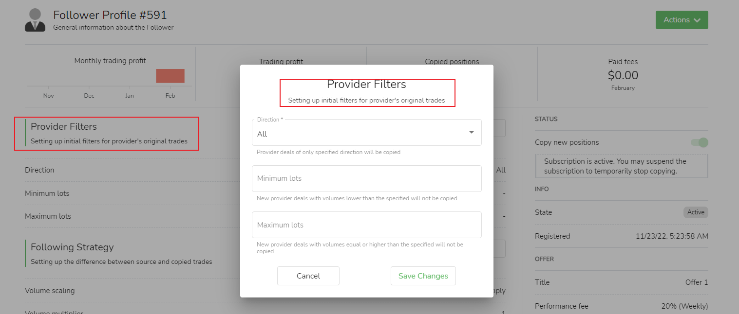 Minimum lot size:The follower can choose the minimum lot size to follow the volume. When the trading volume of the signal source is lower than the set trading volume, it will not follow.