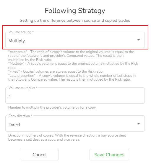 - The correction sets the maximum amount of copied trades that will eventually be executed. CopyTrading's follower can not only control the risk of the trading position of the signal source, but also control the risk of the size of the position they should place.