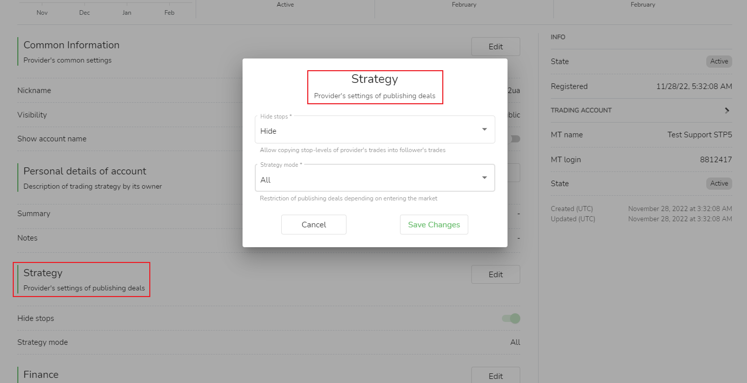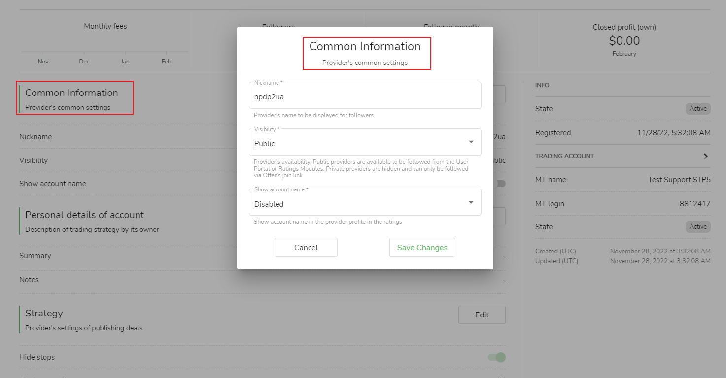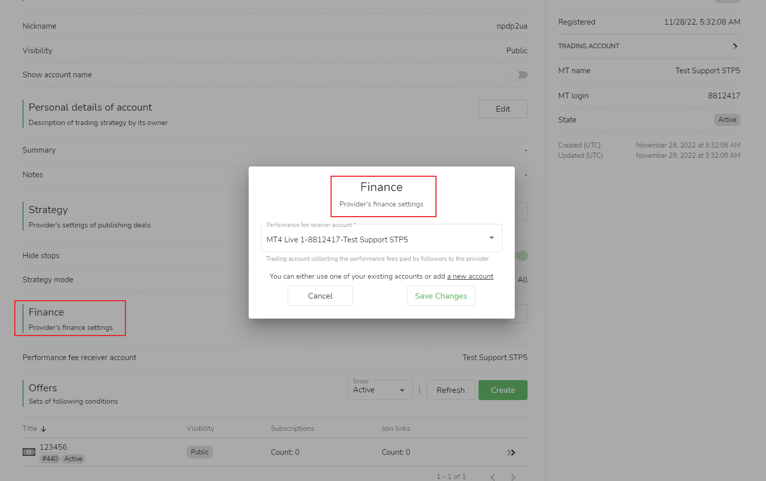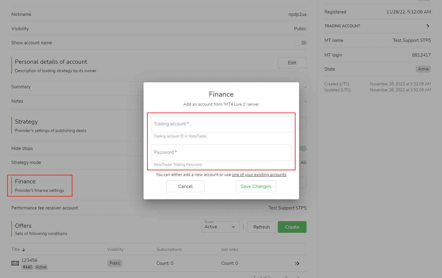 Performance Fee Acceptance Account:The trading account that the signal source collects followers to pay performance fees to the signal source can choose an existing account or add a new account. In the process of adding a new account, you need to fill in the trading account (that is, the trading account in MetaTrader) and the password (that is, the MetaTrader transaction Password) and then click [Save Changes] to complete the settings successfully.