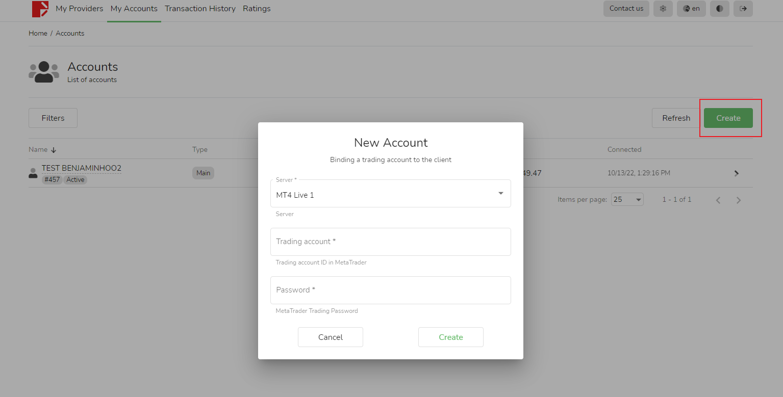 On the [My Account] page of the signal source, you can add a new trading account by clicking the green [Create] button. However, this account cannot be used to log in, and can only be selected as a signal source, follower or set up to receive performance fees.