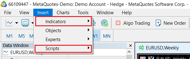 MT5 comes with as many as 38 technical indicators that have been written, and traders can set them independently and use them anytime; click [Insert] in the menu bar, and in the [Insert] option, select [Indicator] or [Script] and then Just click Add.