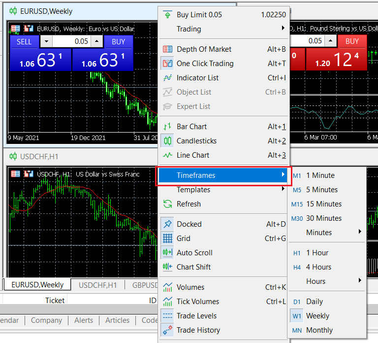 Right-click [Chart] in the menu bar of MT5 and select [Period] to view all the time periods that can be selected in MT5.