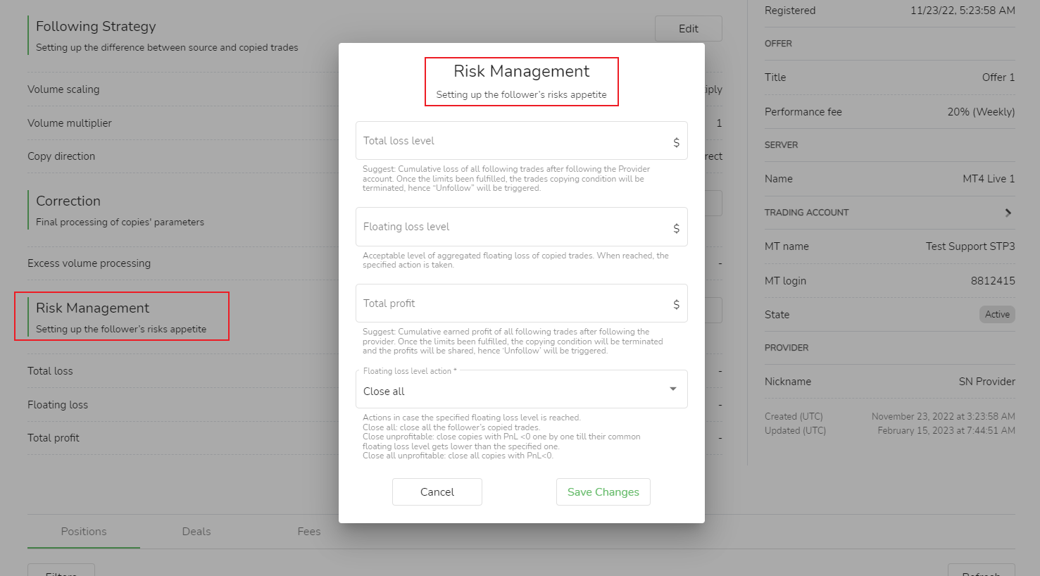 Los seguidores pueden establecer niveles de toma de ganancias y de detención de pérdidas en la gestión de riesgos para administrar el riesgo de sus propias cuentas.