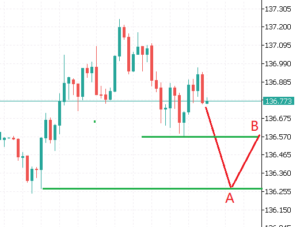 b) Los inversores esperan que el USDJPY rompa el nivel de resistencia de la línea A, y luego rebote y caiga nuevamente cuando la línea B esté bloqueada, por lo que se puede usar el tipo de orden Sell Stop Limit;
