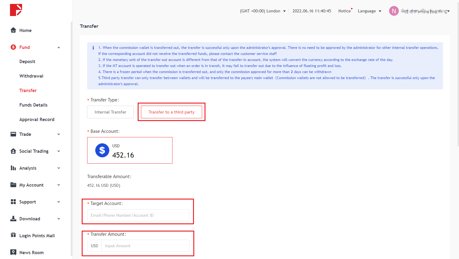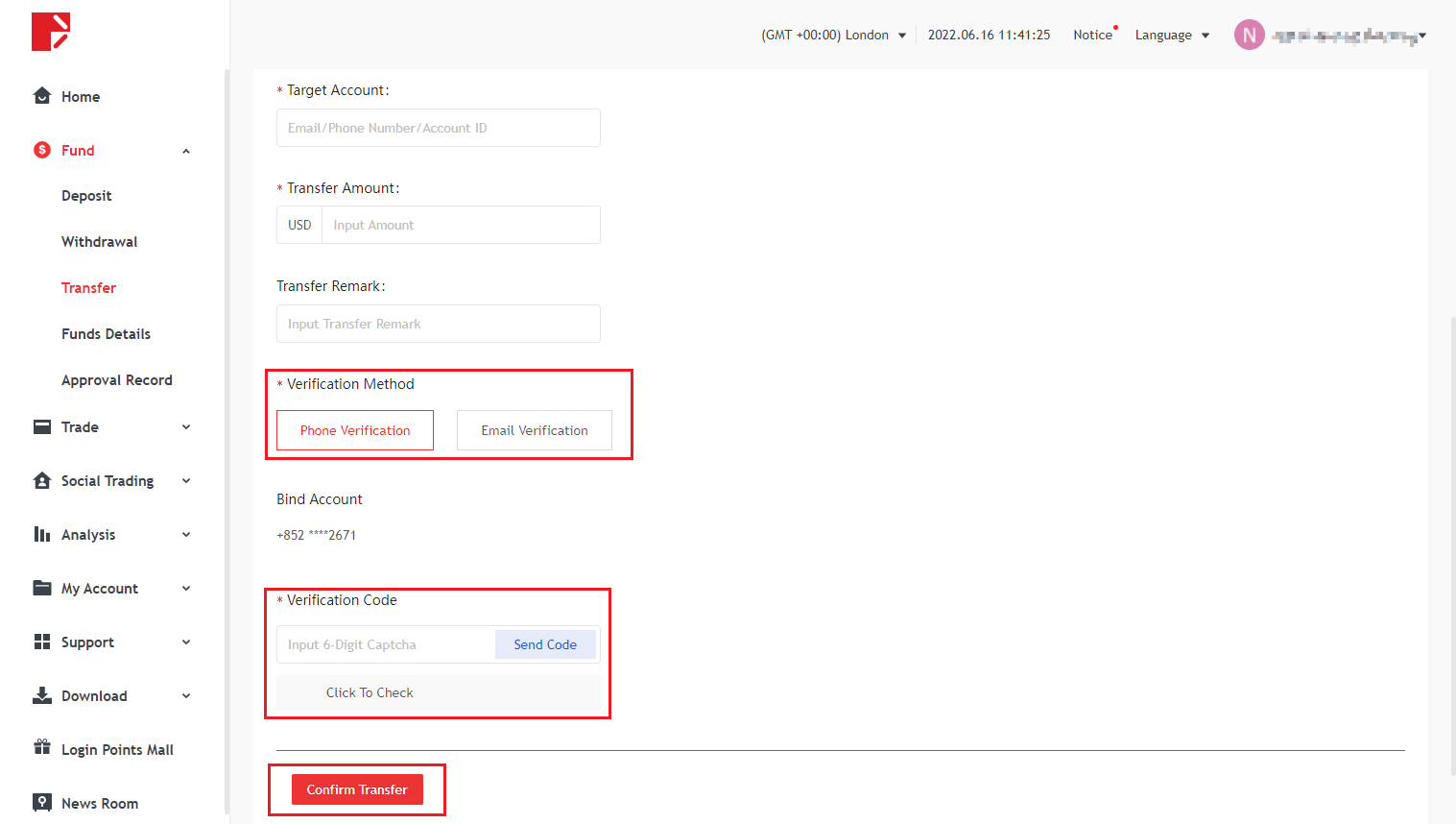 Doo Prime 사용자 센터에 방문하여 홈페이지 왼쪽 열의 "전송"을 클릭하십시오.