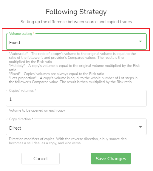 - 카피 계정의 만기 포지션은 시그널 소스 계정의 거래량에 거래량 승수를 곱한 것과 같습니다.