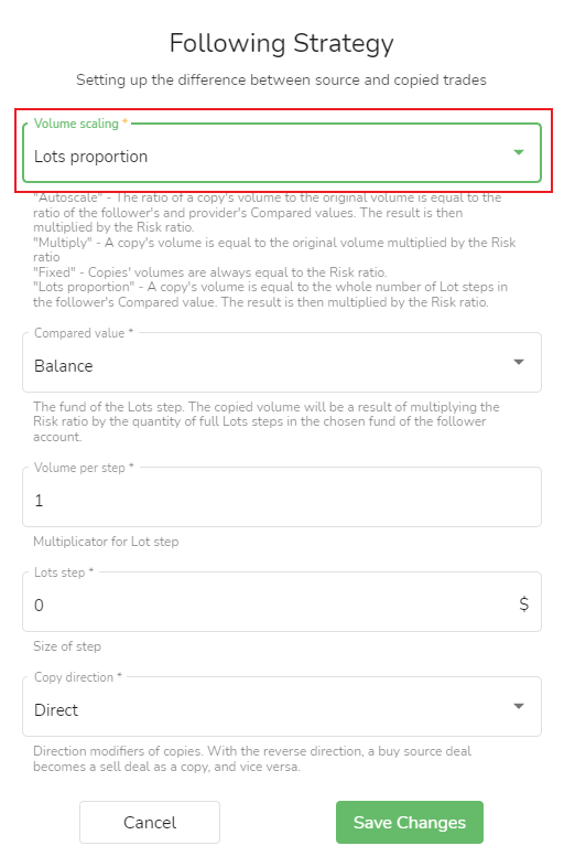 비교값:시그널 소스의 비율과 추종자 계정의 거래량, [Balance] 또는 [Equity]를 선택할 수 있습니다.