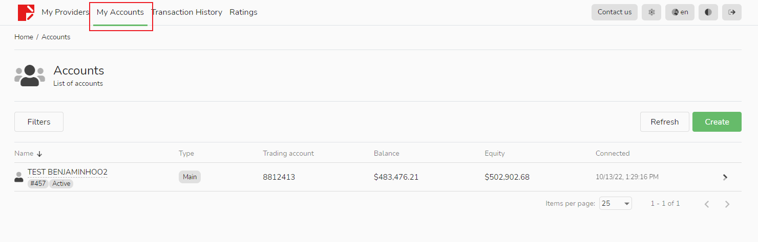 팔로워의 [내 계정] 페이지에서 녹색 [만들기] 버튼을 클릭하여 새로운 거래 계정을 추가할 수 있습니다. 단, 이 계정은 로그인에 사용할 수 없으며 시그널 소스, 팔로워로 선택하거나 실적 수수료를 받는 설정만 할 수 있습니다.