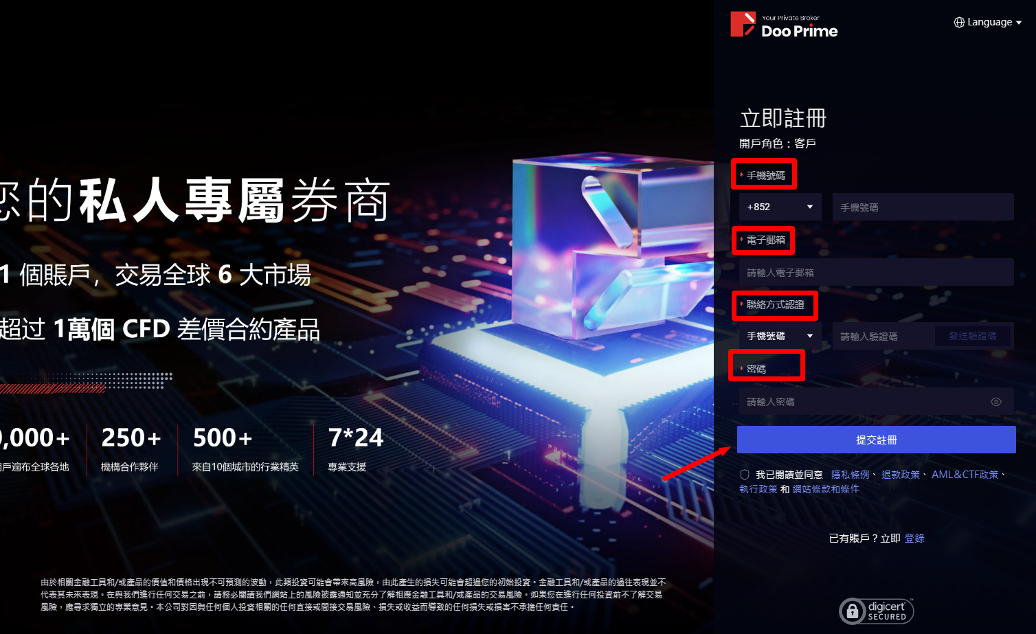 2.3 此时会跳转到注册页面,请在右侧栏目中输入您的手机号码、电子邮箱。 选择认证渠道(可选电子邮箱或手机号码),按「发送验证码」进行验证。 验证成功后,输入密码进行设置。最后,勾选同意条款,点击「提交注册」。