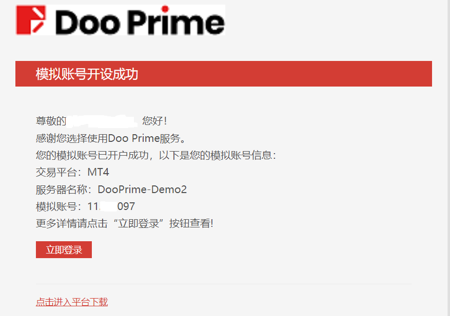 注册完成后,请登录您的个人注册邮箱,收取模拟账户的登录信息,包括「交易平台」「模拟帐号」及「服务器名称」等。