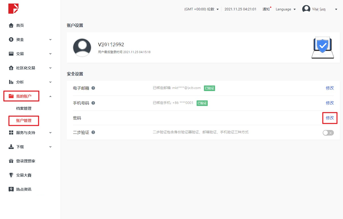 1. 登录 D Prime 用户中心后,在左边栏目按「我的账户」,下选「账户管理」进入「账户设置」界面,在「密码」处按「修改」。