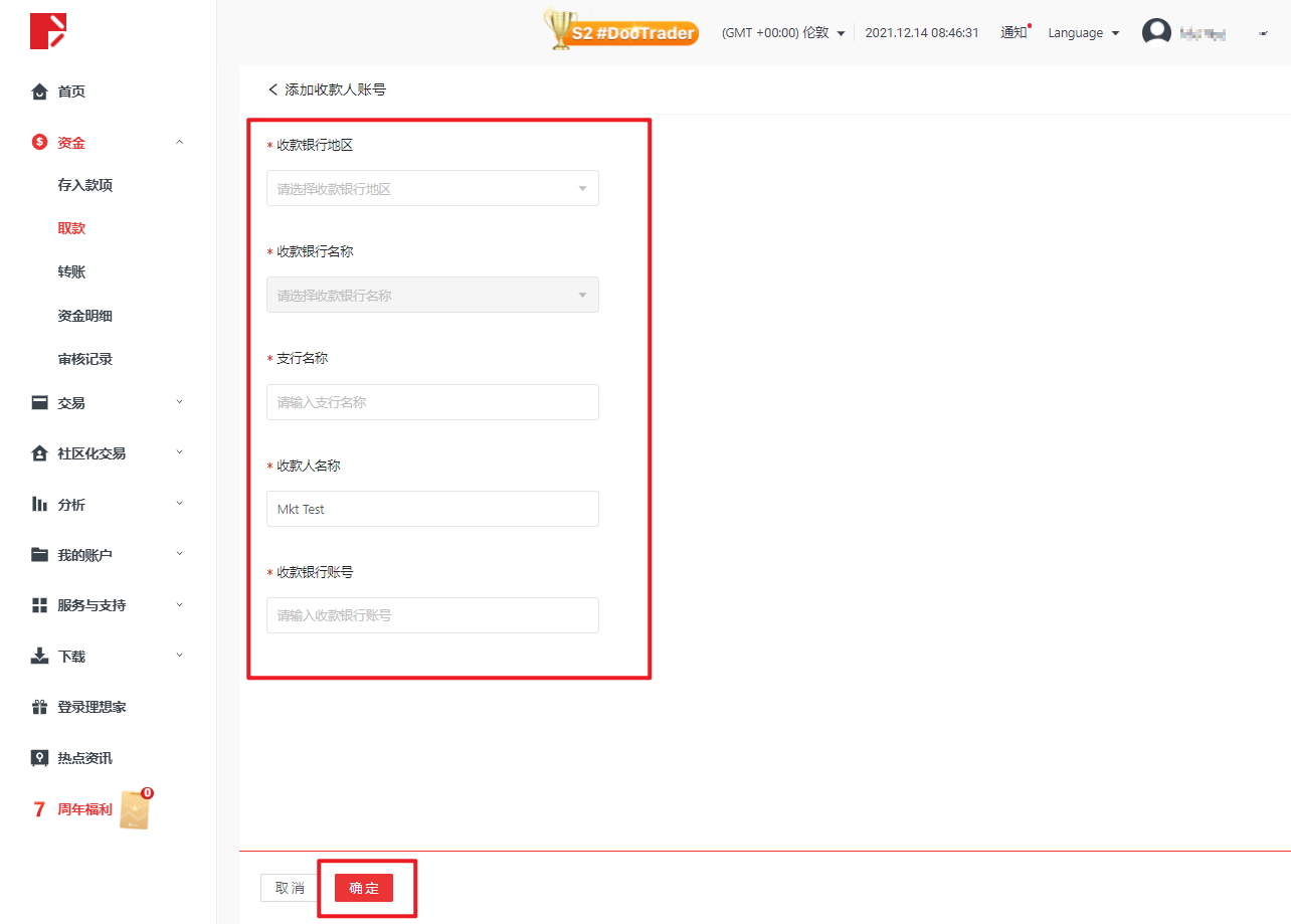选择取款账号和收款人账号,填写取款金额(美金),完成后点击「下一步」。