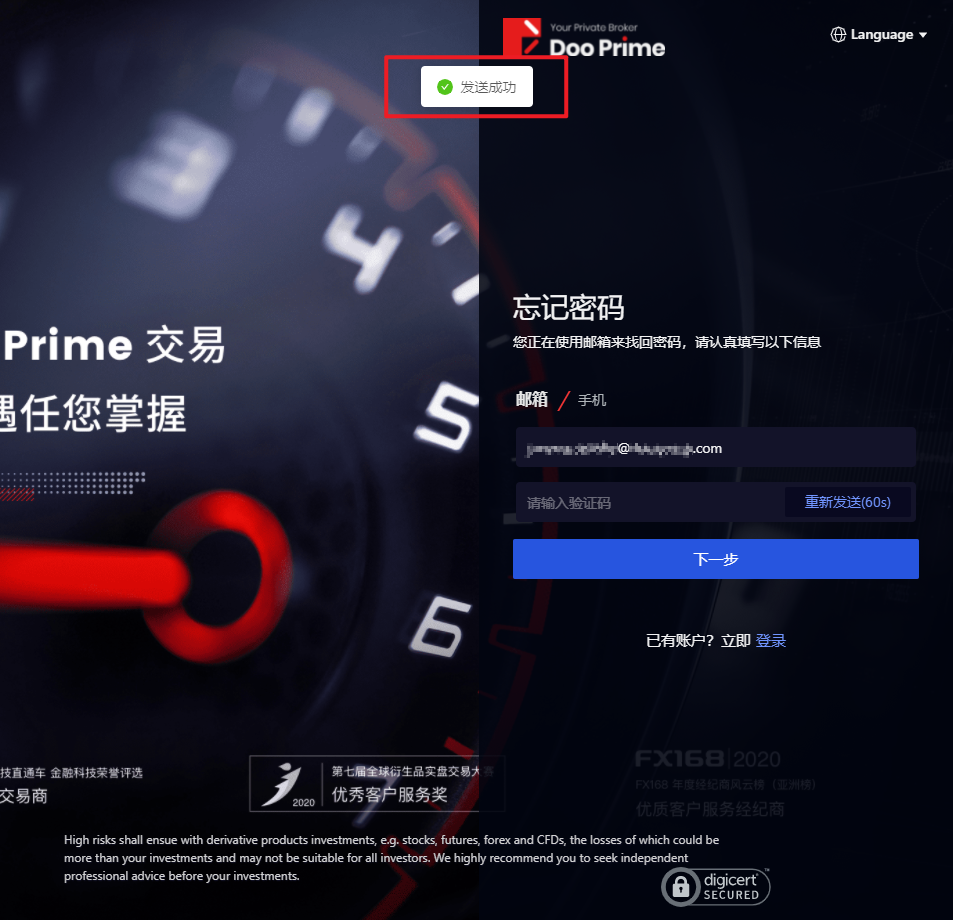 3. 頁面會跳至「忘記密碼」介面,重設D Prime 用戶中心的帳號密碼,點選「下一步」。