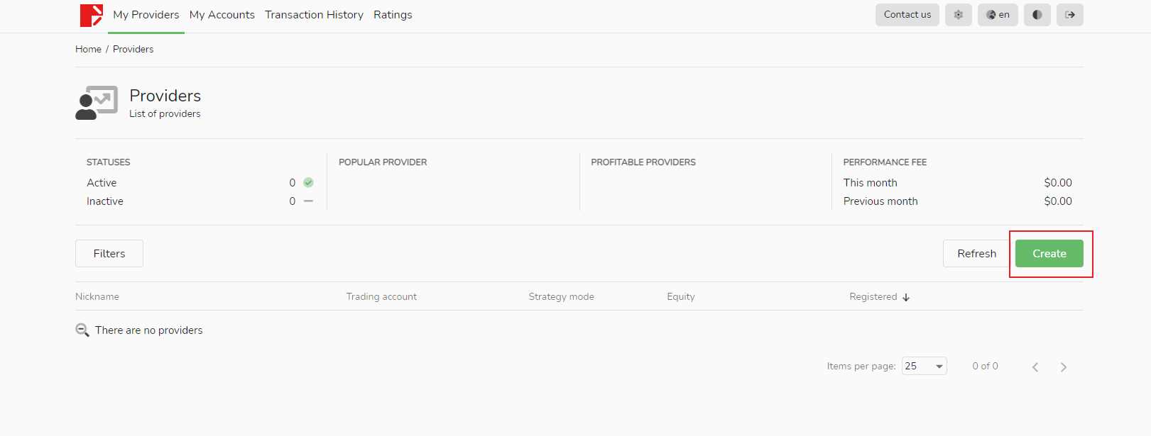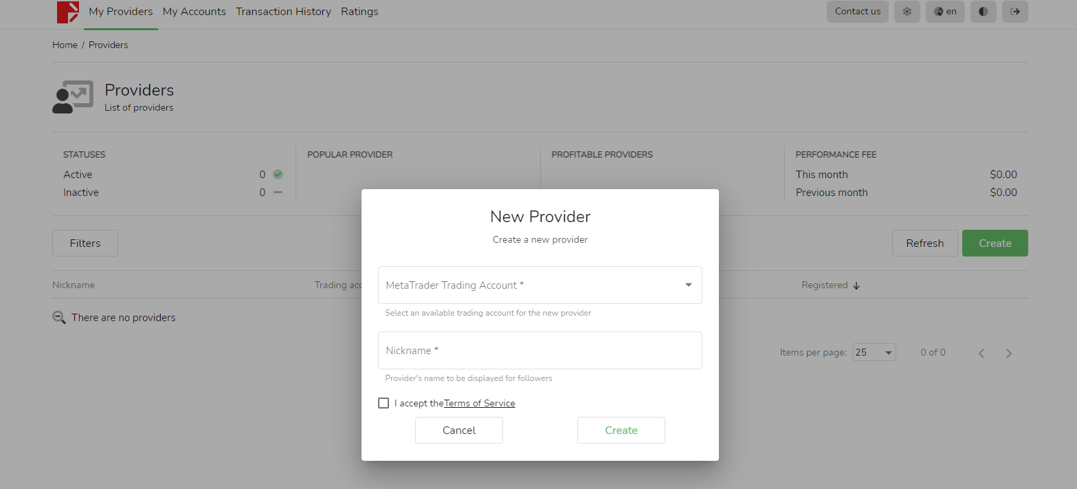 Trên trang [Tài khoản của tôi] của nguồn tín hiệu, bạn có thể thêm tài khoản giao dịch mới bằng cách nhấp vào nút [Tạo] màu lục. Tuy nhiên, tài khoản này không thể được sử dụng để đăng nhập và chỉ có thể được chọn làm nguồn tín hiệu, người theo dõi hoặc thiết lập để nhận phí hiệu suất.