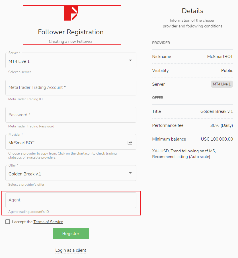 Khi người dùng đăng ký làm người theo dõi, anh ta chỉ cần nhập tài khoản giao dịch MetaTrader của quảng cáo giới thiệu trên trang đăng ký để thêm quảng cáo giới thiệu.