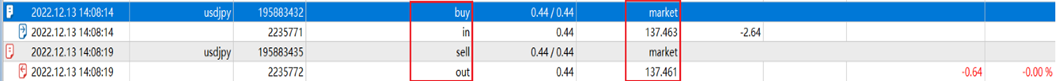 Việc mở và đóng một lệnh được hiển thị riêng biệt theo vào và ra, trong có nghĩa là mở một vị trí, ngoài có nghĩa là đóng một vị trí và chỉ lệnh đóng ngoài mới hiển thị số tiền lãi và lỗ;
